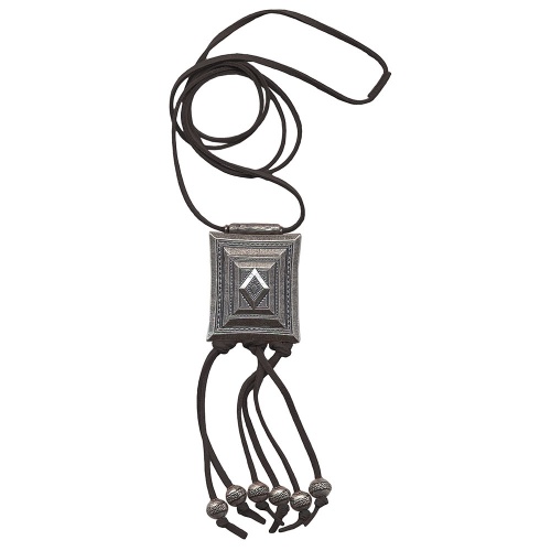 Die dekorative Modeschmuck-Kette mit dem schwarzen viereckigen Anhänger im verspielten Fransenlook passt gut zum rockigen Kleidungsstil. Die 53x45mm große Platte aus Kunststoff mit dem altsilberfarbenem reliefartig hervorgehoben Ornament hängt an einem schwarzen textilen Verlourband und ist mit 6 kurzen Bändern und jeweils einer gemusterten altsilberfarbenen Kunststoffperle verziert. Das ca. 100cm lange Collier ohne Metallbestandteile eignet sich gut als Pulloverkette und kann ohne den Verschluss zu öffnen über den Kopf angelegt werden. Alle Bestandteile dieser Kette wurden in Deutschland produziert und die Kette in Handarbeit - made in germany - fertiggestellt.