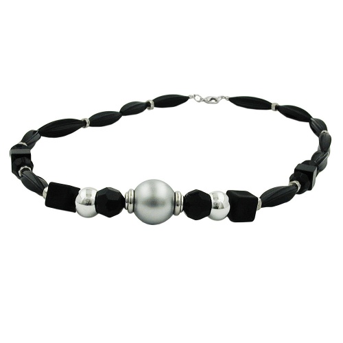 Wunderschöne, klassisch gefädelte Halskette aus verschiedenen schwarz-glänzenden Perlen aus hochwertigem Kunststoff, kombiniert mit verchromten Kunststoffperlen. Blickfang ist die 18mm große, matt-verchromte Perle in der Mitte, sekundiert von zwei verchromt-glänzenden Kunststoffperlen. Die 55cm lange Kette wird mit einem silberfarbenen Karabiner geschlossen. Diese edle Kette ist sowohl für das - Kleine Schwarze - Party-Kostüm wie auch als Trauerschmuck geeignet. Alle Bestandteile dieser Modeschmuck-Kette wurden in Deutschland produziert und die Kette selbst in Handarbeit - made in germany - fertiggestellt.