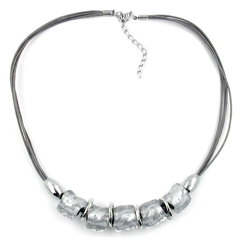 Wunderschöne Modeschmuck-Kette mit fünf 18x6mm großen, grau-transparent-silber-ausgewischten, hochwertigen Kunststoffperlen als Blickfang. Bei den leicht viereckigen, unebenen Perlen, sogenannten Steinperlen, wurden die steinähnlichen Unebenheiten der grau-transparenten Perle silbergrau ausgewischt. Kombiniert mit chromfarbenen Kunststoff-Teilen wurden die Perlen auf 4 Strängen hellgrauer Baumwollkordel und mit einem silberfarbenen Karabiner plus Verlängerungskettchen aus eloxiertem Aluminium verschlossen. Farbiger Schmuck betont die Farben der Kleidung oder setzt zusätzliche Akzente und rundet Ihren Auftritt glanzvoll ab. Alle Bestandteile dieser Modeschmuck-Kette wurden in Deutschland produziert und die Kette selbst in Handarbeit - made in germany - fertiggestellt.