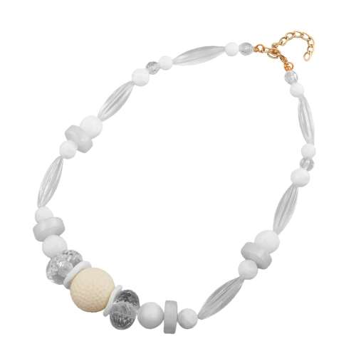 Dekoratives Modeschmuck-Collier, 45cm lang, klassisch gefädelt mit ausgefallenen Kunststoffperlen, Blickfang in der Mitte ist eine 21mm große sattweiße Rundperle in Wabenstruktur. Der Verschluss besteht aus einem goldfarbenen Karabiner mit Verlängerungskettchen aus eloxiertem Aluminium. Weiß ist die Farbe des Lichts und des Sommers, sie verkörpert Reinheit und Unschuld, passt als helle, neutrale Farbe zu jeder anderen Farbe und ist besonders auffällig im Kontrast zu dunklen Farben. Alle Bestandteile dieser Modeschmuck-Kette wurden in Deutschland produziert und die Kette selbst in Handarbeit - made in germany - fertiggestellt.