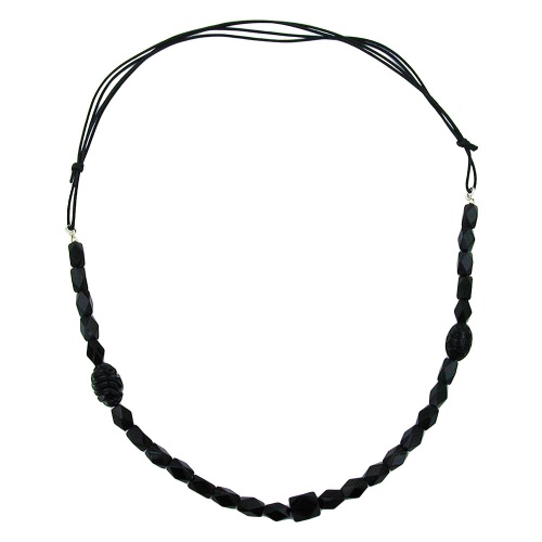 Bei dieser einfarbig schwarzen Modeschmuck-Kette sind viele kleine hochwertige schwarze Kunststoffperlen mit facettierten Kanten, sogenannte Schliffperlen, mit 3 anderen schwarzen Perlen kombiniert. Der gefädelte Perlenkettenteil wird mit einer doppelten schwarzen 0,6mm-Baumwollkordel verbunden, dadurch liegt die Kette leicht und angenehm am Hals oder unter einem Kragen. Die Gesamtlänge beträgt 90cm und ist einkürzbar mittels Schiebeknoten auf 75cm. Lange Ketten ab 60cm eignen sich gut als Pulloverkette und können ohne den Verschluss zu öffnen über den Kopf angelegt werden. Durch die universell einsetzbare Farbe Schwarz ist dieses Collier ein wunderbares Accessoire für Ihre Basismode und passt gut zum klassischen Schwarz-Weiß-Stil. Alle Bestandteile dieser Kette wurden in Deutschland produziert und die Kette selbst in Handarbeit - made in germany - fertiggestellt.
