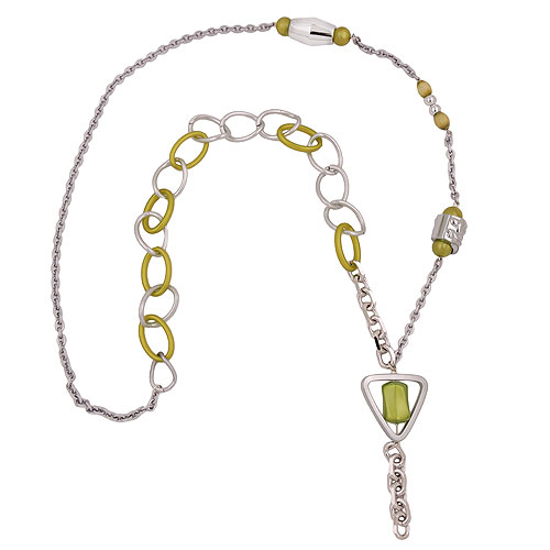 Wer die Asymmetrie liebt, liegt mit dieser hippen Y-Kette goldrichtig! Rockig und edel zugleich erscheint diese 90cm lange Pulloverkette mit den Strängen aus unterschiedlichen Metallketten und hellgrün-oliv-farbenen Kunststoffkettengliedern. Die fantasiereiche Kombination aus verchromten Aluminiumketten und Perlen sowie altsilberfarbenen und hellgrünen Kunststoffperlen passt gut zum sportlichen Jeanslook. Lange Ketten ab 60cm eignen sich gut als Pulloverkette und können ohne den Verschluss zu öffnen über den Kopf angelegt werden. Farbiger Schmuck betont die Farben der Kleidung oder setzt zusätzliche Akzente. Alle Bestandteile dieser Kette wurden in Deutschland produziert und die Kette selbst in Handarbeit - made in germany - fertiggestellt.