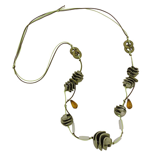 Blickfang dieser dekorativen Modeschmuck-Kette bildet eine wunderschöne Spiralperle aus Kunststoff in seidig-hellgrüner Farbe, kombiniert mit, in Form und Farbe unterschiedlichen, farblich aufeinander abgestimmten olivgrünen Kunststoffperlen, kunstvoll eingeknotet in doppelter lüstrierter (gewachster) Baumwollkordel, zweifarbig, hellgrün und oliv, 0,6mm dick und 100cm lang. Die Kette besitzt einen verstellbaren Schiebeknoten zum Regulieren der Länge. Lange Ketten ab 70cm eignen sich gut als Pulloverketten und können ohne den Verschluss zu öffnen über den Kopf angelegt werden. Farbiger Modeschmuck betont die Farben der Kleidung oder setzt zusätzliche Akzente. Alle Bestandteile dieser Kette wurden in Deutschland produziert und in Handarbeit - made in germany - fertiggestellt.