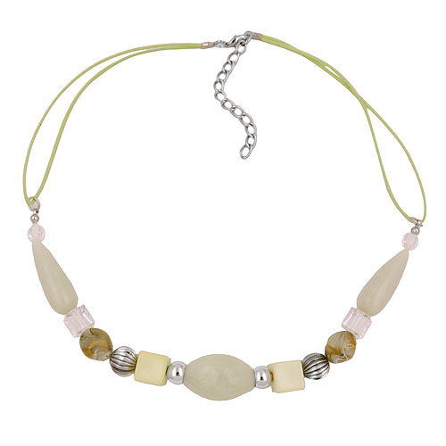 Diese helle Halskette passt hervorragend zu sommerlicher Kleidung und gebräunter Haut. Die hochwertigen Kunststoffperlen in hellen Farben sind bei diesem wunderschönen Collier geschmackvoll mit altsilber- und chromfarbenen Kunststoffperlen kombiniert, den Blickfang bildet die 26x16mm große, hellgrüne Oliven-Perle in der Mitte. Der gefädelte Mustersatz wird durch die doppelte lindgrüne Baumwollkordel aufgenommen, dadurch liegt die 45cm lange Kette angenehm weich am Hals. Der Verschluss besteht aus einem silberfarbenen Karabiner plus Verlängerungskettchen aus eloxiertem Aluminium. Alle Bestandteile der Modeschmuck-Kette wurden in Deutschland produziert und die Kette selbst in Handarbeit - made in germany - fertiggestellt.