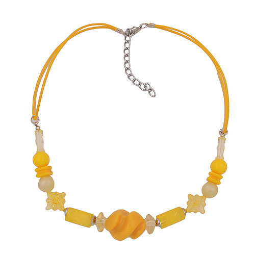 Diese sonnengelbe Halskette passt hervorragend zu sommerlicher Kleidung und setzt auch farbige Akzente bei dunkler Kleidung. Die hochwertigen gelben Kunststoffperlen in verschiedenen Formen und Farbnuancen sind bei diesem wunderschönen Collier geschmackvoll kombiniert, den Blickfang bildet die 24x19mm große Schraubenperle in der Mitte. Der gefädelte Mustersatz wird durch die doppelte gelbe 0,6mm dünne Baumwollkordel aufgenommen, dadurch liegt die 42cm lange Kette angenehm weich am Hals. Der Verschluss besteht aus einem silberfarbenen Karabiner plus Verlängerungskettchen aus eloxiertem Aluminium. Alle Bestandteile der Modeschmuck-Kette wurden in Deutschland produziert und die Kette selbst in Handarbeit - made in germany - fertiggestellt.