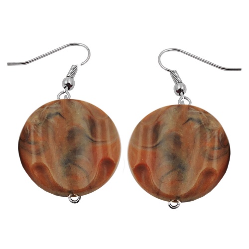 Die kleinen runden Modeschmuck-Ohrringe setzen den passenden i-Punkt zu den Farben Ihrer Kleidung. Der Ohrhänger besteht aus einem Pendel mit einer 22mm großen, 8mm dicken, braun-marmorierten Kunststoffperle Scheibe mit reliefartig gestalteter Oberflächenstruktur, befestigt an einem silberfarbenen Ohrhaken aus Messing (Weißbronze), Gesamtlänge mit Haken 44mm. Alle Bestandteile des Ohrschmucks wurden in Deutschland produziert und in Handarbeit - made in germany - fertiggestellt. Verkauf paarweise.