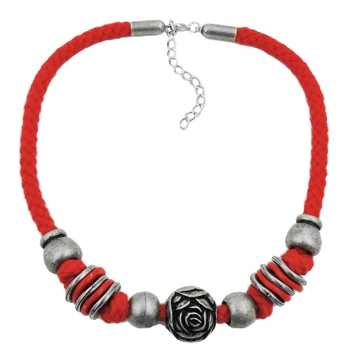 Diese schöne kurze Halskette im Landhaus-Stil passt perfekt zu uriger Trachtenmode. Blickfang ist die 21mm große altsilberfarbene Trachtenperlen mit dem Rosenmuster in der Mitte, kombiniert mit weiteren altsilberfarbenen Kunststoffperlen, abgeteilt durch Knoten in der 6mm dicken, weichen, roten Baumwollkordel, passend zu vielen Dirndl-Farben. Die Kette wird mit einem silberfarbenen Karabiner-Verschluss plus Verlängerungskettchen aus eloxiertem Aluminium geschlossen. Alle Bestandteile dieser Kette wurden in Deutschland produziert und die Kette selbst in Handarbeit - made in germany - fertiggestellt.