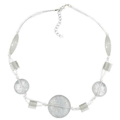 Dekorative weiß-transparente Modeschmuck-Kette mit unterschiedlich großen und geformten Kunststoffperlen in weiß-transparent und perlmutt-flitter, kunstvoll eingeknotet in doppelter lüstrierter (gewachster) weißer 0,6mm-Baumwollkordel mit silberfarbenem Karabiner-Verschluss plus Verlängerungskettchen aus eloxiertem Aluminium. Weiß ist die Farbe des Lichts und des Sommers, sie verkörpert Reinheit und Unschuld, passt als helle, neutrale Farbe zu jeder anderen Farbe und ist besonders auffällig im Kontrast zu dunklen Farben. Alle Bestandteile dieser Modeschmuck-Kette wurden in Deutschland produziert und die Kette selbst in Handarbeit - made in germany - fertiggestellt.