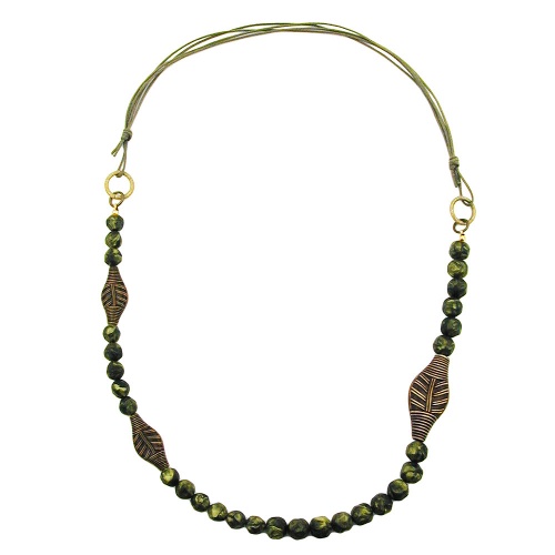 Herbstliche Modeschmuck-Kette im Materialmix aus hochwertigen Kunststoff-Perlen. Bei dieser wunderschönen olivgrünen Modeschmuck-Kette wurden 10mm große, oliv-schwarz-marmorierte, gedrückte Kunststoffperlen, sogenannte Barockperlen, asymmetrisch mit 3 interessanten flachen, blattförmigen Perlen aus hochwertigem Kunststoff gefädelt, auf jeder Seite mit einem altgoldfarbenen, strukturierten Ring, der wiederum mit einer doppelten olivfarbenen Baumwollkordel, verbunden. Die Kette trägt sich durch die Kordel im Halsbereich sehr angenehm und schaut auch unter einem Blusenkragen richtig gut hervor. Die Gesamtlänge beträgt 90cm und ist einkürzbar mittels Schiebeknoten auf 75cm. Lange Ketten ab 60cm eignen sich gut als Pulloverkette und können ohne den Verschluss zu öffnen über den Kopf angelegt werden. Farbiger Schmuck betont die Farben der Kleidung oder setzt zusätzliche Akzente. Alle Bestandteile dieser Kette wurden in Deutschland produziert und die Kette selbst in Handarbeit - made in germany - fertiggestellt.