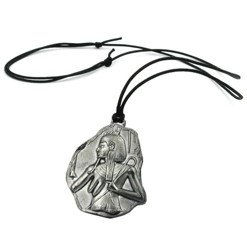 Für Ägypten-Fans! Der auffallende große Anhänger mit dem reliefartig ausgestellten Oberkörper einer Frau aus der ägyptischen Mythologie wurde aus einer Metall-Legierung im Zinn-Schleuderguss-Verfahren hergestellt. Der mit 92% hohe Zinnanteil sorgt dabei für die dunkel schimmernde Metall-Oberfläche. Die Rückseite der 45x42mm großen Platte mit dem unregelmäßigen Rand ist glatt. Der Zinn-Anhänger ist an einer 0,8mm dünnen einfachen schwarzen gewachsten Baumwollkordel mit einem verstellbaren Schiebeknoten zum Regulieren der Länge bis 100cm befestigt. Lange Ketten eignen sich gut als Pulloverketten und können ohne den Verschluss zu öffnen über den Kopf angelegt werden. Alle Bestandteile dieser Kette wurden in Deutschland produziert und die Kette selbst in Handarbeit - made in germany - fertiggestellt.
