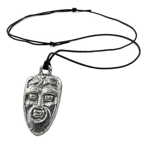 Der detailreiche Anhänger sieht einer mystischen Maske ähnlich und wurde aus einer Metall-Legierung im Zinn-Schleuderguss-Verfahren hergestellt und ist hinten hohl. Der mit 92% hohe Zinnanteil sorgt dabei für die antik aussehende feinkörnige Oberfläche. Der 47x29mm große Zinn-Anhänger ist an einer 0,6mm dünnen einfachen schwarzen gewachsten Baumwollkordel mit einem verstellbaren Schiebeknoten zum Regulieren der Länge bis 100cm befestigt. Lange Ketten eignen sich gut als Pulloverketten und können ohne den Verschluss zu öffnen über den Kopf angelegt werden. Alle Bestandteile dieser Kette wurden in Deutschland produziert und die Kette selbst in Handarbeit - made in germany - fertiggestellt.