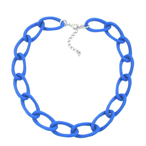 Diese farbintensive Halskette aus blau-matten, federleichten, 35x18mm großen groben Kettengliedern aus Kunststoff komplettiert wunderbar die leichte Sommermode und passt auch gut zur Jeansmode. Der silberfarbene Verschluss mit dem 14mm großen Karabiner plus Verlängerungskettchen ist aus eloxiertem Aluminium. Farbiger Schmuck betont die Farben der Kleidung oder setzt zusätzliche Akzente. Alle Bestandteile dieser 45cm langen Modeschmuck-Kette wurden in Deutschland produziert und die Kette selbst in Handarbeit - made in germany - fertiggestellt.