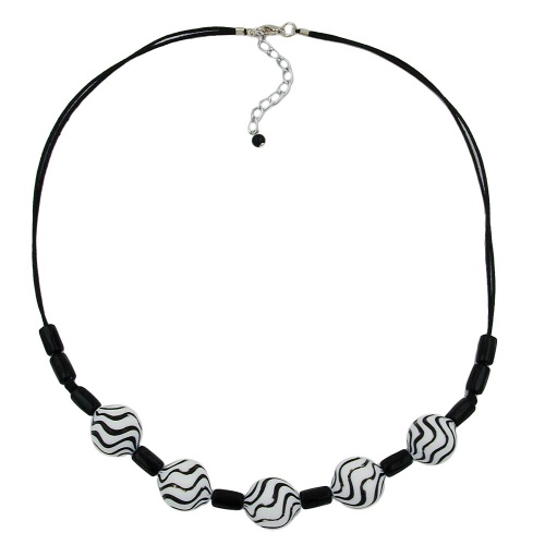 Diese wunderschöne 50cm lange Halskette im klassischen Schwarz-Weiß-Stil ist das passende trendige Accessoire für Ihre Basismode. Fünf 19mm große weiße Rundperlen aus Kunststoff mit aufgespritzten schwarzen Wellen sind zusammen mit kleinen schwarzen Walzen auf eine doppelt gelegte 0,6mm dünne schwarze Baumwollkordel gezogen und mit einem silberfarbenen Karabiner plus Verlängerungskettchen aus eloxiertem Aluminium verschlossen. Alle Bestandteile dieser Modeschmuck-Kette wurden in Deutschland produziert und die Kette selbst in Handarbeit - made in germany - fertiggestellt.