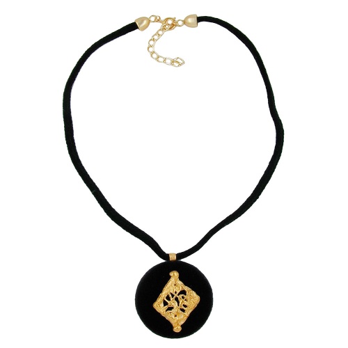 Edle Samt-Halskette - passend für das kleine Schwarze! Die 42mm große, schwarze, samtartig bezogene Kunststoffplatte, die ein goldfarbener verschnörkelter trapezförmiger Besatz aus Metallguss verziert, hängt an einem 45cm langen schwarzen Velour-Samtband und wird mit einem goldfarbenen Federring plus Verlängerungskettchen aus eloxiertem Aluminium geschlossen. Diese ausgefallene Modeschmuck-Kette passt gut zur schwarzen Abendgarderobe und festlicher Kleidung. Alle Bestandteile der Kette wurden in Deutschland produziert und die Kette in Handarbeit - made in germany - fertiggestellt.