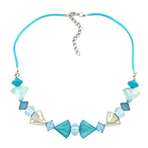 Raffinierte Modeschmuck-Kette in leuchtendem Türkisblau - türkisfarbene und hellblaue Kunststoffperlen in verschiedenen Formen wurden bei dieser wunderschönen Halskette mit verchromten Dreieckperlen geschmackvoll kombiniert. Der gefädelte Mittelteil wird durch eine dünne, türkisfarben-glänzende Atlasbiese (Kunstseide) aufgenommen, dadurch liegt die Kette angenehm weich am Hals. Der Verschluss besteht aus einem silberfarbenen Karabiner plus Verlängerungskettchen aus eloxiertem Aluminium. Farbiger Modeschmuck betont die Farben der Kleidung oder setzt zusätzliche Akzente. Alle Bestandteile dieser Modeschmuck-Kette wurden in Deutschland produziert und die Kette selbst in Handarbeit - made in germany - fertiggestellt.