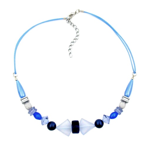 Verschiedene Kunststoffperlen in hellblau-transparent, blau-marmoriert und silberfarben wurden bei dieser wunderschönen Halskette geschmackvoll kombiniert. Der gefädelte Mittelteil wird durch die doppelt gelegte 0,6mm dünne hellblaue Baumwollkordel aufgenommen, dadurch liegt die Kette angenehm weich am Hals. Der Verschluss besteht aus einem silberfarbenen Karabiner plus Verlängerungskettchen aus eloxiertem Aluminium. Alle Bestandteile dieser Modeschmuck-Kette wurden in Deutschland produziert und die Kette selbst in Handarbeit - made in germany - fertiggestellt.