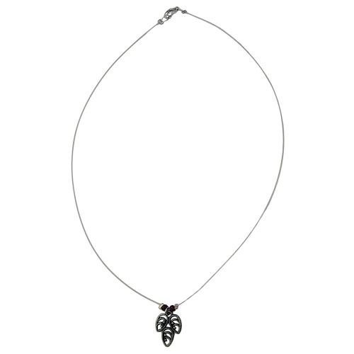 Dezente kurze Halskette, 42cm lang, jugendlich-verspieltes Collier mit einem kleinen filigranen Anhänger aus Kunststoff, der einem Blatt ähnlich sieht, altsilberfarben galvanisiert und 15mm groß ist. In Kombination mit 2 kleinen roten Glasperlen rechts und links, fest aufgezogen und verzurrt auf einem kunststoffummantelten Edelstahldraht und verschlossen mit einem kleinen silberfarbigen Karabiner. Alle Bestandteile dieser Modeschmuck-Kette wurden in Deutschland produziert und die Kette selbst in Handarbeit - made in germany - fertiggestellt. Der weiche und geschmeidige Draht liegt gut am Hals an und sollte beim Schlafengehen und während der Aufbewahrung sorgfältig abgelegt werden um Knicke im Verlauf zu vermeiden.