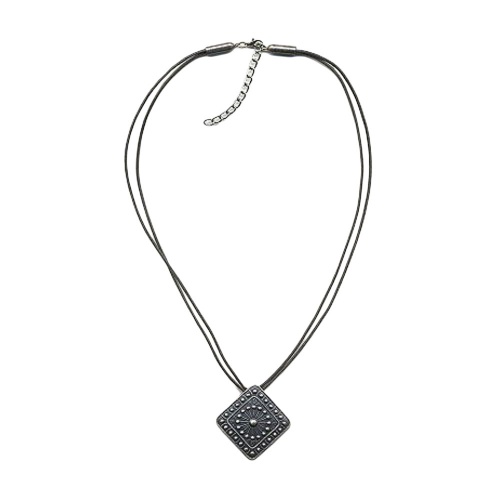 Die dekorative Halskette mit dem einzelnen altsilberfarbenen Anhänger passt gut zur urigen Trachtenmode. Der 33x33mm große Anhänger aus Metallguss ähnelt mit dem hervorgehobenen Muster an altertümliches Kunsthandwerk aus der Ritterzeit. Der rustikal wirkende Anhänger hängt mit seiner verdeckten Schlaufe auf der Rückseite an einer 50cm langen, doppelten grauen Baumwollkordel und ist mit einem silberfarbenen Karabiner plus Verlängerungskettchen aus eloxiertem Aluminium verschlossen. Alle Bestandteile dieser Modeschmuck-Kette wurden in Deutschland produziert und die Kette selbst in Handarbeit - made in germany - fertiggestellt.