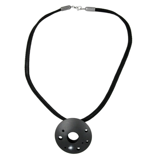 Diese dekorative Modeschmuck-Kette mit dem auffällig großen Anhänger ist ein echter Blickfang! Die 49mm große gewölbte Doppelscheibe mit dem Lochmuster und dem kleinen weißen Glasstein auf der Vorderseite ist aus Metall hergestellt und wurde anthrazit-matt beschichtet. Durch den oberen Teil des Anhängers führen zwei 3mm dicke schwarze Baumwollkordeln und die 50cm lange dieser Halskette wird mit einem silberfarbenen Karabiner verschlossen. Die rustikale Modeschmuck-Kette mit dem außergewöhnlichen Design passt mit dem neutralen dunkelgrauen Farbton besonders gut zur Jeansmode und zur Herbst- und Winterkleidung und zu starken Frauen. Alle Bestandteile dieser Kette wurden in Deutschland produziert und die Kette in Handarbeit - made in germany - fertiggestellt.