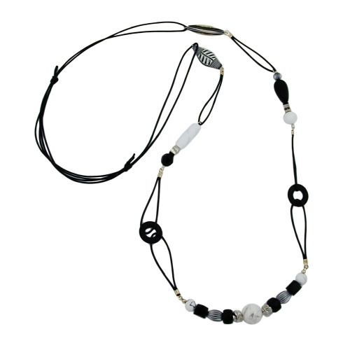 Bei dieser grazilen Halskette im klassischen Schwarz-Weiß-Stil wurden einzeln gefädelte Mustersätze und schwarze Kunststoffscheiben kunstvoll mit einer doppelten 0,6mm dünnen schwarzen Baumwollkordel verbunden. Die abwechslungsreich gestalteten Mustersätze wurden mit unterschiedlichen schwarzen, weißen und silberfarbenen Kunststoffperlen geschmackvoll kombiniert. Die 105cm lange Pulloverkette besitzt einen verstellbaren Schiebeknoten zum Regulieren auf Wunschlänge. Alle Bestandteile dieser wunderschönen Modeschmuck-Kette wurden in Deutschland produziert und die Kette selbst in Handarbeit - made in germany - fertiggestellt. Diese extravagante lange Halskette ist das passende i-Tüpfelchen und wunderbares Accessoire für Ihre Basismode.