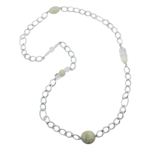 Wunderschöne 95cm lange Modeschmuck-Kette für die modebewusste Trägerin mit verschiedenartigen hell-olivfarbenen und transparenten Kunststoffperlen an federleichten Aluminium-Weitpanzer-Kettengliedern. Zwischen die 12mm breite Weitpanzerkette aus hellgrau eloxiertem Aluminium ist auch eine ausgefallene türkis-grün-gelb-transparente, hochwertige Kunststoffperle gekettelt, 25x25x12mm groß und beidseitig kissenartig gewölbt. Die rustikale Kette mit den zarten Farbklecksen passt zu pastellfarbenen Sommerkleidern ebenso wie zum sportlichen Jeanslook. Lange Ketten eignen sich gut als Pulloverketten und können ohne einen Verschluss zu öffnen über den Kopf angelegt werden. Alle Bestandteile dieser Kette wurden in Deutschland produziert und die Kette selbst in Handarbeit - made in germany - fertiggestellt.