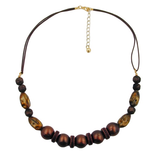 Diese wunderschöne Modeschmuck-Kette in warmen Brauntönen passt hervorragend zu allen erd- und naturfarbenen Kleidungsstücken. Fünf dunkelbraune, seidig glänzende, 16mm große Kunststoffperlen sind bei dieser Halskette mit hochwertigen braun-gold-marmorierten Perlen geschmackvoll kombiniert. Der gefädelte Mittelteil wird durch die doppelte braune 0,6mm dünne Baumwollkordel aufgenommen, dadurch liegt die 50cm lange Kette angenehm weich am Hals. Der goldfarbene Karabiner-Verschluss plus Verlängerungskettchen besteht aus eloxiertem Aluminium und eine kleine goldfarbene Kunststoff-Perle bildet den Abschluss als Anhängsel. Alle Bestandteile dieser Kette wurden in Deutschland produziert und die Kette selbst in Handarbeit - made in germany - fertiggestellt.