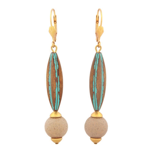 Von wegen altbacken! Diese auffallend großen Modeschmuck-Ohrringe mit dem verwitterten Charme eines historisch-wertvollen Schmuckstücks setzen den passenden Kontrast zu langweiligen Farben in der Oberbekleidung. Der 66mm lange Ohrhänger besteht aus einer 10x7mm großen grün-türkisfarbenen Rillenolive aus Kunststoff mit Patina-Effekt, der altmessingfarben durchschimmert, und einer 12mm großen hellbraunen Rundperle aus Kunststoff. Das ingesamt 66x12mm große Ohrpendel hängt an einem goldfarbenen Ohrhaken aus Messing. Alle Bestandteile des Ohrschmucks wurden in Deutschland produziert und in Handarbeit - made in germany - fertiggestellt. Verkauf nur paarweise.