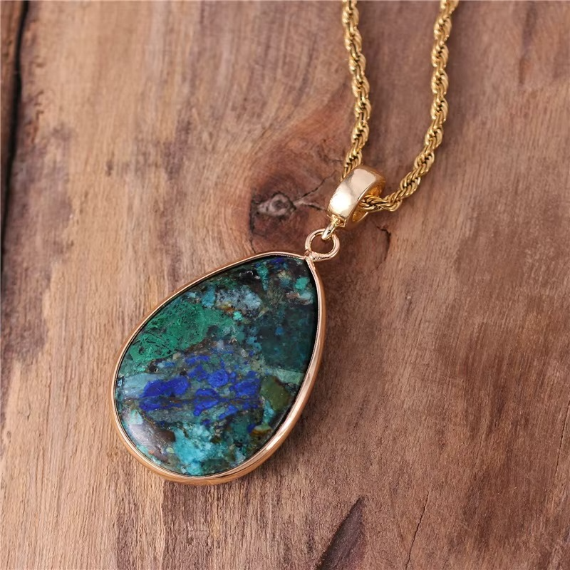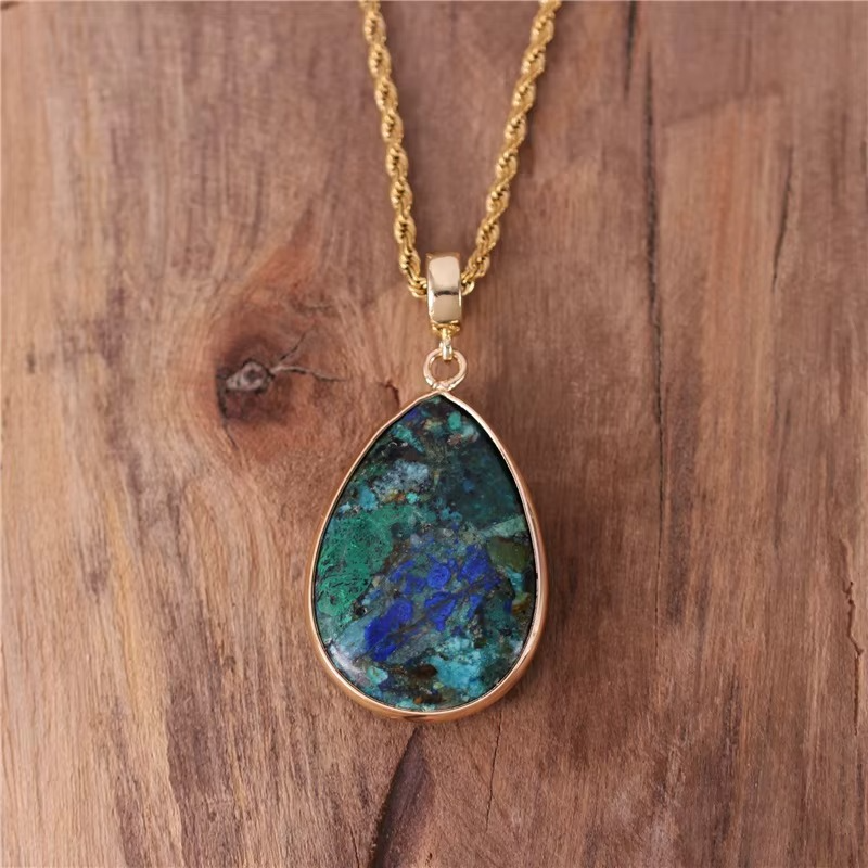 Diese Kette verbindet einen tropfenförmigen Chrysokoll-Anhänger mit einer feinen, goldfarbenen Edelstahlkette. Die Blau- und Grüntöne des Steins erinnern an Wasser, Weite und innere Ruhe.