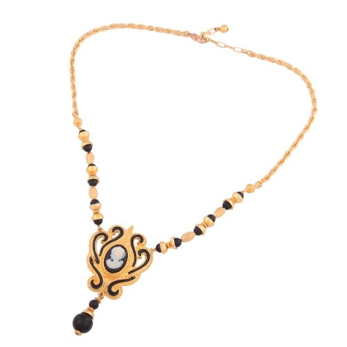 Prachtvolles schwarz-goldfarbenes Modeschmuck-Collier mit Kunststoff-Gemme, ein echter Hingucker für Ihr Dekolleté! Der 42x77mm große Anhänger ist beidseitig mit gefädelten schwarz-goldenen Perlen an einer 3mm dicken Doppelankerkette (Metall, Messinglegierung, unechtes Material) aufgehängt. Die Gesamtlänge beträgt 50cm plus Verlängerungskettchen mit Karabinerverschluss. Diese edle Modeschmuck-Kette wurde in Deutschland - made in germany - hergestellt. Passend dazu werden 1 Paar Ohrclips gratis dazu geliefert.