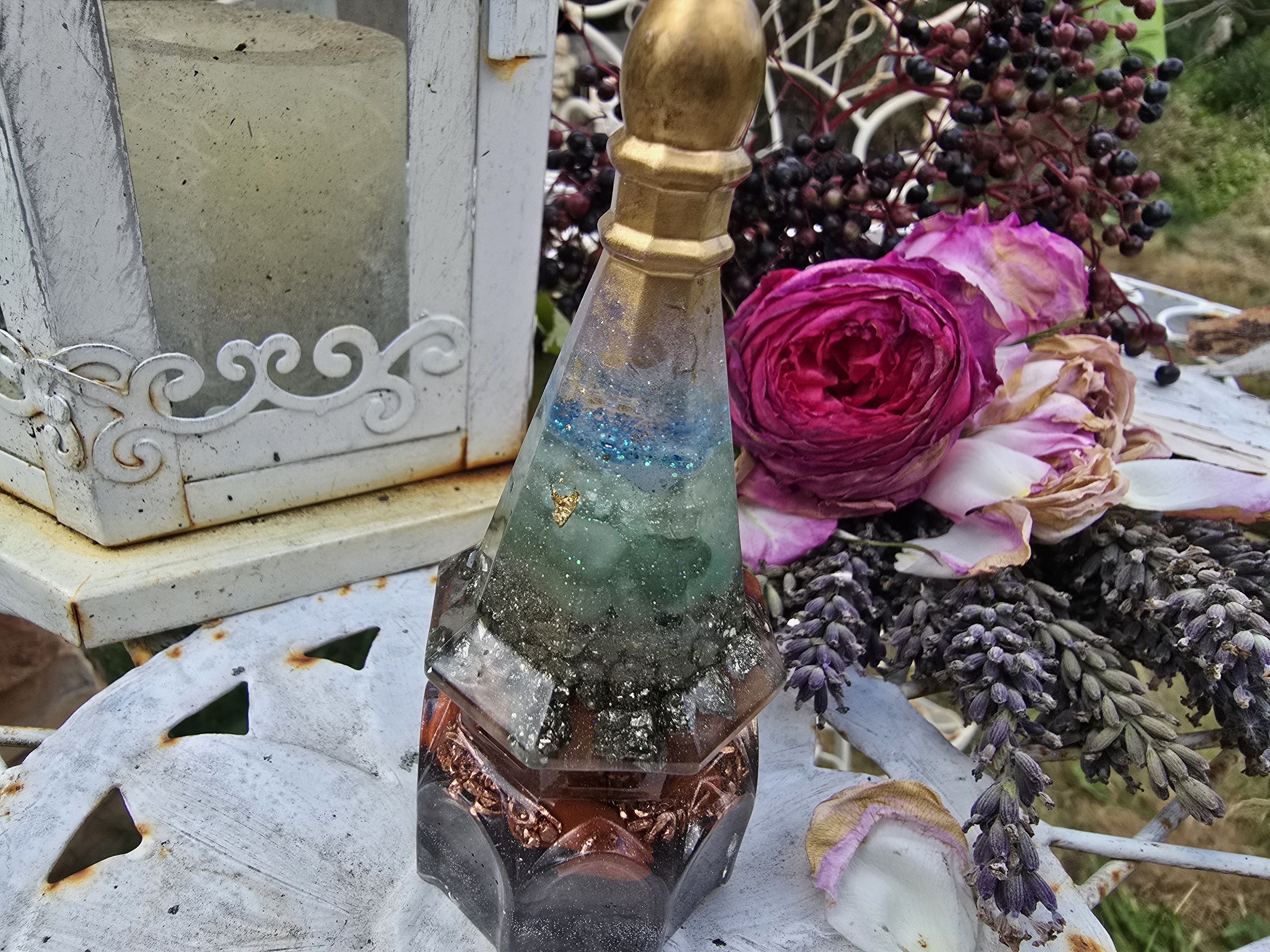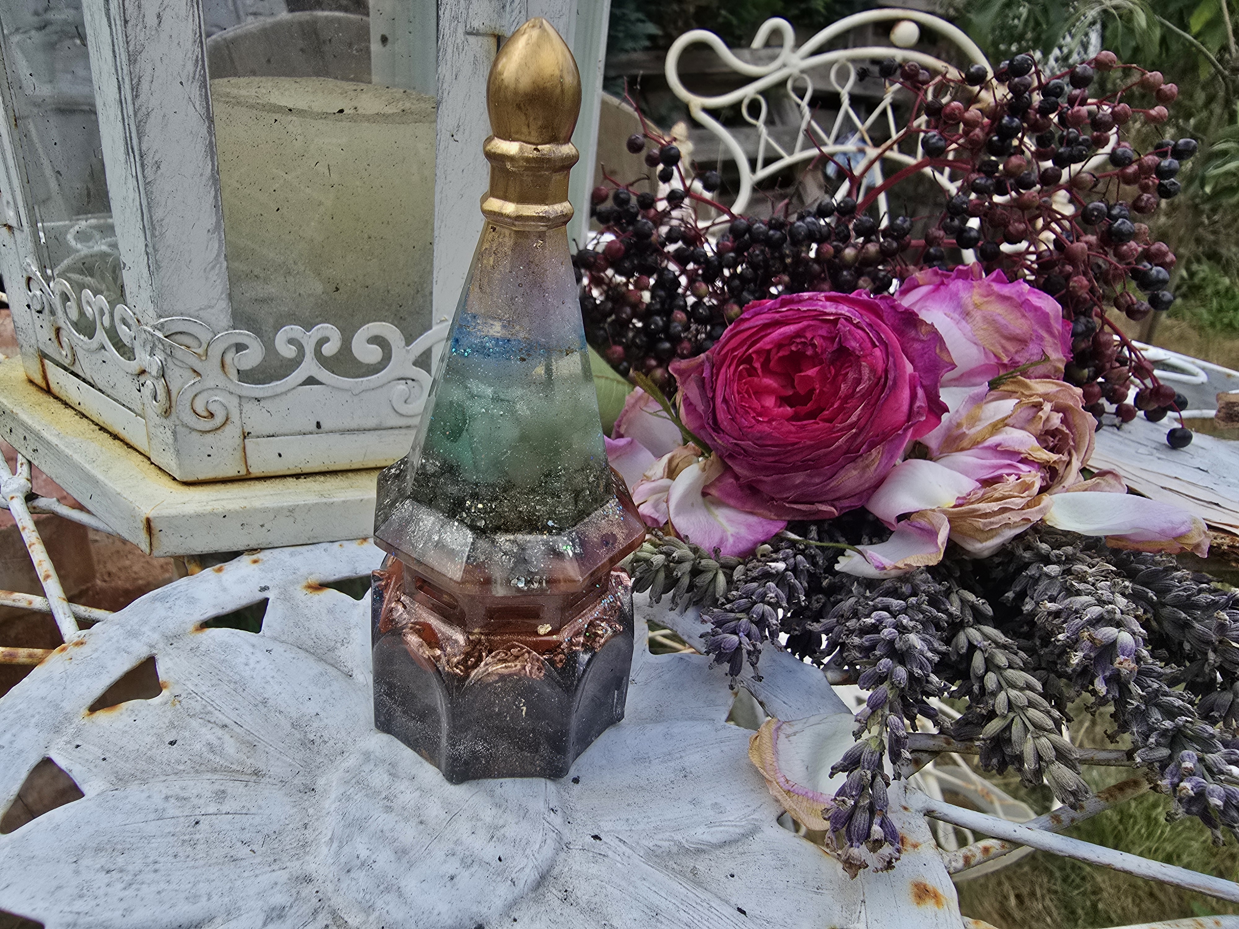 Für das Wurzelchakra, Muladhara wurde der rote Jaspis gewählt, er soll die Willenskraft stärken. Für das Sakralchakra, Svadhishthana, wirkt der Karneol. Dieser Stein sorgt für gute Durchblutung und fördert die Fähigkeit, Probleme schnell zu lösen. Der Solarplexus, Manipura wird hier von dem feurigen Pyrit unterstützt. Dieser Stein konfrontiert mit dem eigenen Charakter und deckt Erinnerungen auf. Das Herzchakra, Anahata erhält in diesem Türmchen den Aventurin. Aventurin soll die Herzregeneration fördern. Er macht geduldig und beruhigt bei Wut und Ärger. Für das Kehlchakra, Vishuddha, wurde der hellblaue Chalcedon eingesetzt. Er fördert die Kommunikation, vermittelt Leichtigkeit und verhilft zu einer optimistischen Lebenseinstellung. Das dritte Auge Chakra, Ajna wird hier durch den Amethysten unterstützt. Der wunderschöne und vielseitige Kristallquarz fördert die Bewusstheit und die Verarbeitung unserer Wahrnehmung. Die Spitze des Turmes, das Kronenchakra, Sahasrara wird hier durch den Bergkristall vertreten. Er gibt Energie und fördert die Entwicklung, die unserem inneren Wesen entspricht. Das wirkungsvolle Türmchen wird zusätzlich durch eine pulverisierte Metallmischung und Kupfergranulat gestärkt.