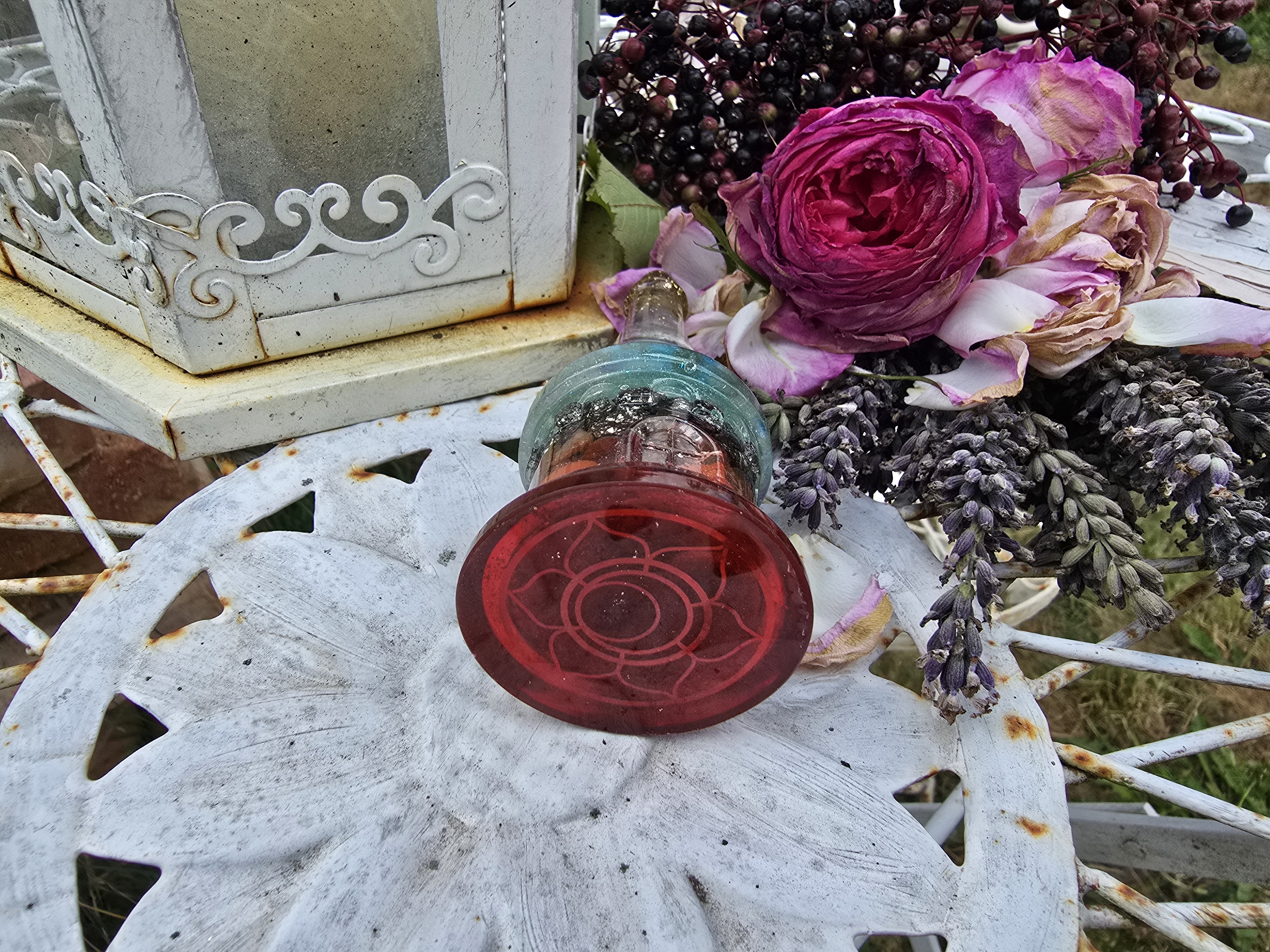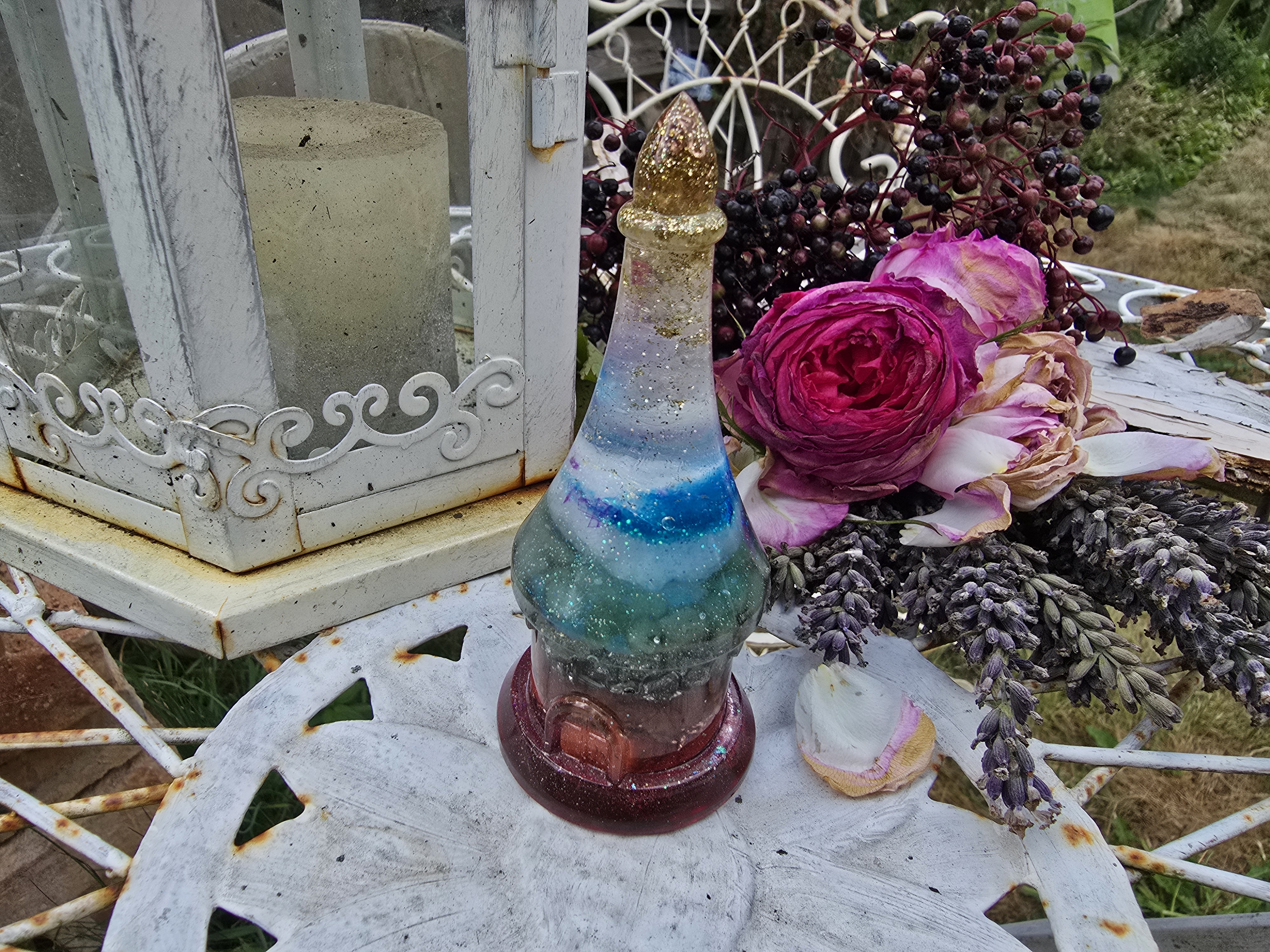Für das Wurzelchakra, Muladhara wurde der rote Jaspis gewählt, er soll die Willenskraft stärken. Für das Sakralchakra, Svadhishthana, wirkt der Karneol. Dieser Stein sorgt für gute Durchblutung und fördert die Fähigkeit, Probleme schnell zu lösen. Der Solarplexus, Manipura wird hier von dem feurigen Pyrit unterstützt. Dieser Stein konfrontiert mit dem eigenen Charakter und deckt Erinnerungen auf. Das Herzchakra, Anahata erhält in diesem Türmchen den Aventurin. Aventurin soll die Herzregeneration fördern. Er macht geduldig und beruhigt bei Wut und Ärger. Für das Kehlchakra, Vishuddha, wurde der hellblaue Chalcedon eingesetzt. Er fördert die Kommunikation, vermittelt Leichtigkeit und verhilft zu einer optimistischen Lebenseinstellung. Das dritte Auge Chakra, Ajna wird hier durch den Amethysten unterstützt. Der wunderschöne und vielseitige Kristallquarz fördert die Bewusstheit und die Verarbeitung unserer Wahrnehmung. Die Spitze des Turmes, das Kronenchakra, Sahasrara wird hier durch den Bergkristall vertreten. Er gibt Energie und fördert die Entwicklung, die unserem inneren Wesen entspricht. Das wirkungsvolle Türmchen wird zusätzlich durch eine pulverisierte Metallmischung und Kupfergranulat gestärkt.