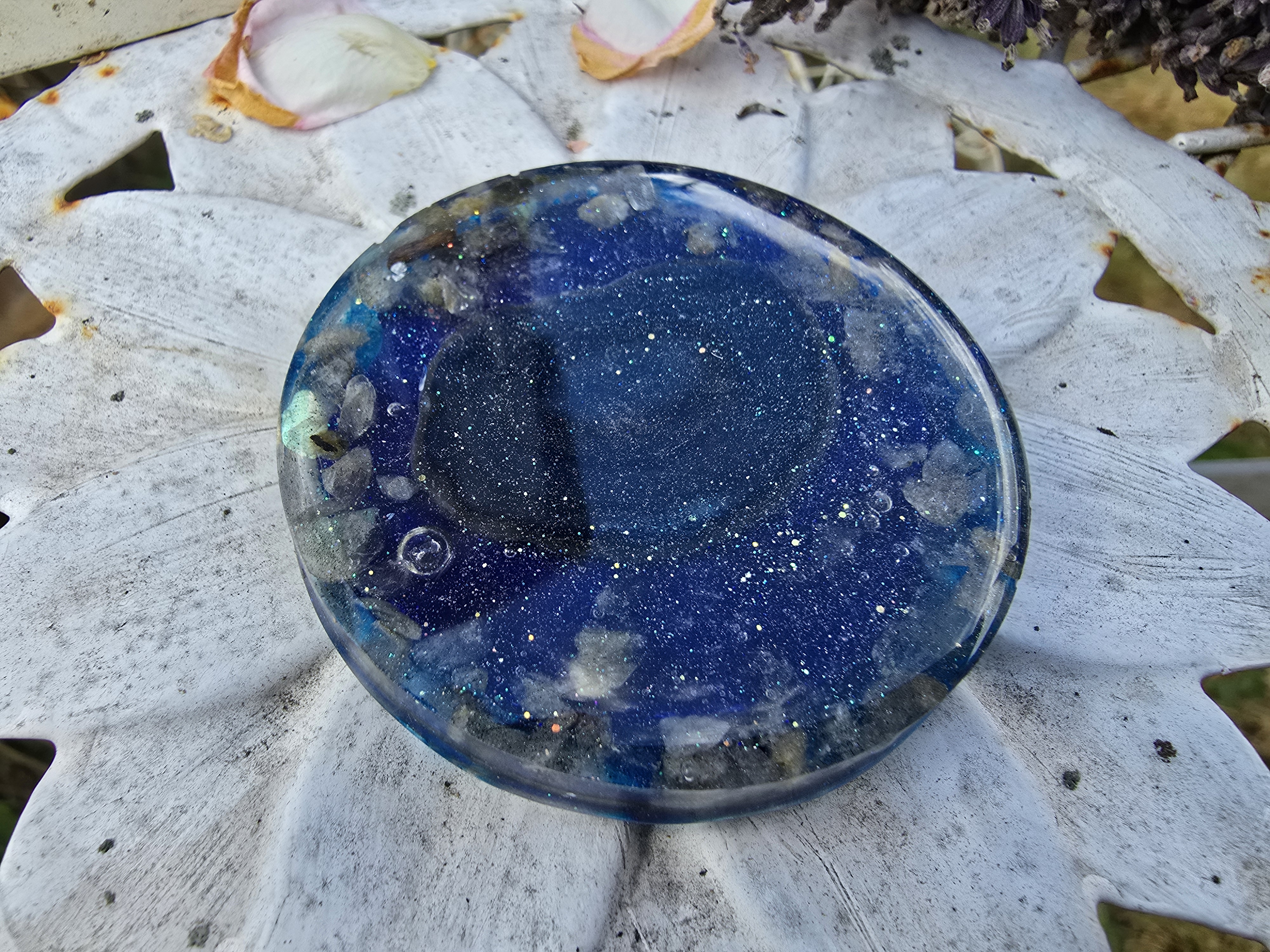 Die andere Seite der Energieplatte ist mit den Labradoriten und einer Achatscheibe befüllt.