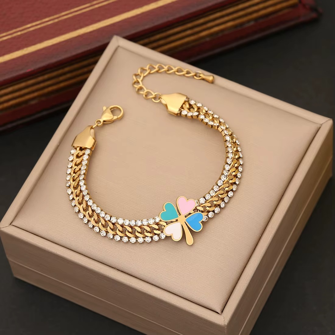 Dieses goldfarbene Armband vereint modernes Design mit einem sanften Symbol: dem Kleeblatt als Zeichen für Glück und Leichtigkeit. Die eingefassten Zirkonia-Steine sorgen für ein dezentes Funkeln, ohne aufdringlich zu wirken.