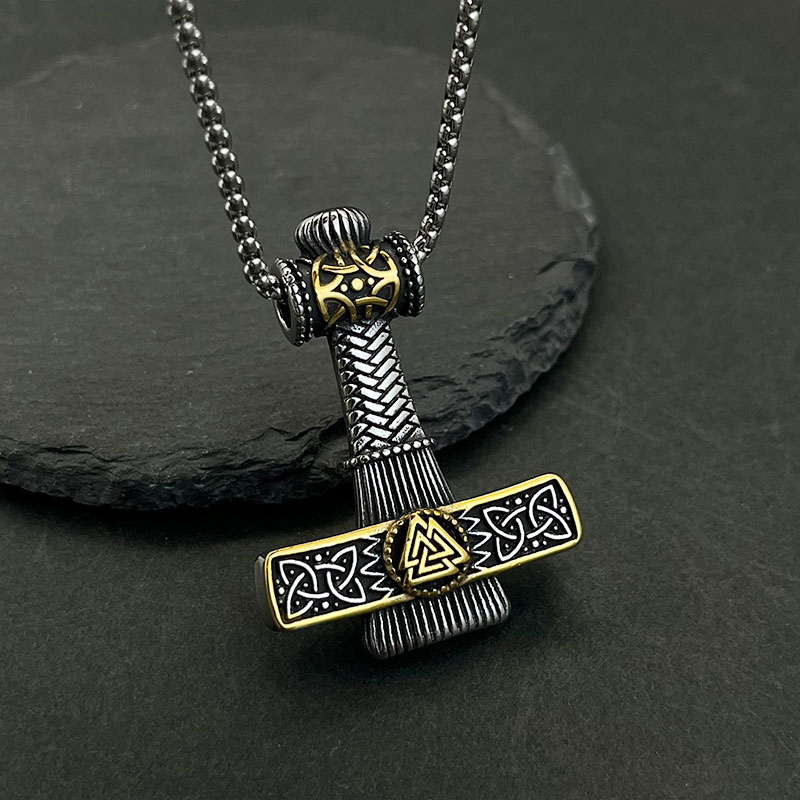 Ein zentrales Triquetra-Symbol (Valknut) setzt einen bewussten Akzent auf dem Hammerkopf und unterstreicht die symbolische Kraft des Designs. Die strukturierte Gestaltung des Schafts sowie die präzise Ausarbeitung des Kopfes verleihen dem Schmuckstück eine kraftvolle, handwerkliche Ausstrahlung.