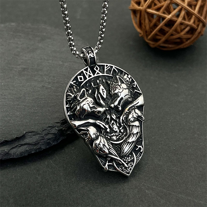 Diese Halskette mit doppeltem Wolf-Anhänger vereint nordische Symbolik in einer kraftvollen, ausgewogenen Form. Zwei Wölfe stehen für Loyalität und Stärke, ergänzt durch Raben als Zeichen von Weisheit und Weitblick. Die Runenelemente unterstreichen die tiefe Verbundenheit zur nordischen Tradition.