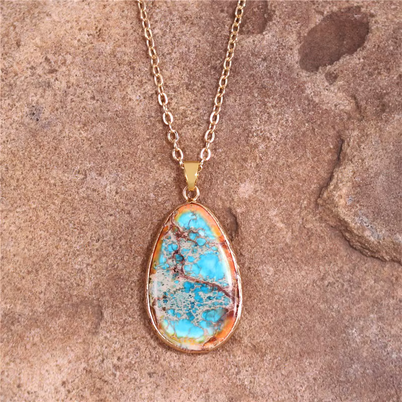 Diese Kette verbindet einen tropfenförmigen Kaiser-Jaspis mit einer feinen, goldfarbenen Edelstahlkette. Die natürliche Zeichnung des Steins macht jedes Stück zu einem kleinen Unikat.
