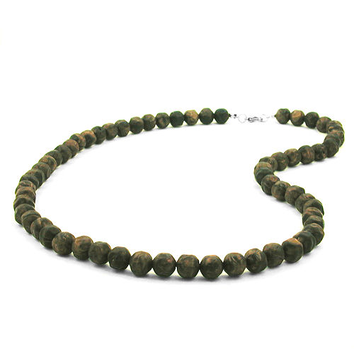 Diese wunderschöne olivgrüne Perlenkette aus 10mm großen, oliv-schwarz-marmorierten, metallisch glänzenden, unrunden, rundum leicht angedrückt wirkenden Kunststoff-Perlen passt sehr gut zur kuscheligen Herbst- und Wintermode. Die 60cm lange, klassisch gefädelte Modeschmuck-Kette hat einen silberfarbener Karabiner-Verschluss mit einem Verlängerungskettchen aus eloxiertem Aluminium und eine kleine passende Perle als Abschluss. Alle Bestandteile dieser Kette wurden in Deutschland produziert und die Kette selbst in Handarbeit - made in germany - fertiggestellt.