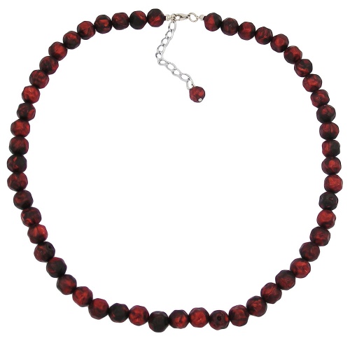 Diese wunderschöne schwarz-rote Perlenkette aus 10mm großen, rot-schwarz-marmorierten, metallisch glänzenden, unrunden, rundum leicht gedrückt wirkenden Kunststoff-Perlen passt gut zur kuscheligen Herbst- und Wintermode. Die 50cm lange, klassisch gefädelte Kette hat einen silberfarbenen Karabiner-Verschluss mit einem Verlängerungskettchen aus eloxiertem Aluminium und einer passenden Perle als Abschluss. Alle Bestandteile dieser Modeschmuck-Kette wurden in Deutschland produziert und die Kette selbst in Handarbeit - made in germany - fertiggestellt.
