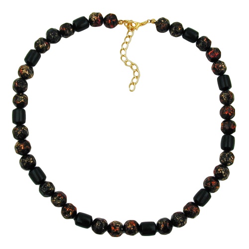 Diese zeitlos schöne kurze halsnahe Perlenkette mit schwarzen glänzenden 10x8mm-Kunststoffperlen in Walzenform, abwechselnd gefädelt mit rot-schwarz-gold-gesprenkelten 10mm-Barockperlen, unrunden, rundum leicht angedrückt wirkenden Kunststoff-Perlen, passt sehr gut zur kuscheligen Herbst- und Wintermode. Den dekorativen Abschluss der 42cm langen Modeschmuck-Kette bildet ein goldfarbener Karabiner-Verschluss plus Verlängerungskettchen aus eloxiertem Aluminium. Alle Bestandteile dieser Kette wurden in Deutschland produziert und die Kette selbst in Handarbeit - made in germany - fertiggestellt.