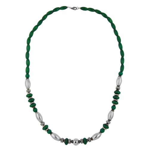 Grün ja grün sind alle meine Kleider heisst es in einem deutschen Kinderlied. Hier besticht die 70cm lange, gefädelte Holzperlenkette durch ihre tannengrüne Farbe, farblich unterbrochen durch chrom-glänzende und chrom-matte Perlen aus hochwertigem Kunststoff. Die unterschiedlichen, grünen Perlen sind alle aus leichtem Holz gefertigt, die Kette damit insgesamt angenehm leicht zu tragen. Lange Ketten ab 60cm eignen sich gut als Pulloverketten und können auch ohne den silberfarbenen Karabiner-Verschluss zu öffnen über den Kopf angelegt werden. Alle Bestandteile dieser Modeschmuck-Kette wurden in Deutschland produziert und die Kette selbst in Handarbeit - made in germany - fertiggestellt.