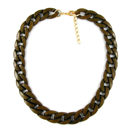 Diese zeitlos schöne einfarbige Modeschmuck-Kette aus olivfarbenen glänzenden Kunststoff-Kettengliedern ist universell einsetzbar und komplettiert wunderbar die Herbst- und Wintermode. Die 17mm breite und 45cm lange federleichte Flachpanzerkette wird mit einem goldfarbenen Karabiner plus Verlängerungskettchen aus eloxiertem Aluminium verschlossen. Farbiger Modeschmuck betont die Farben der Kleidung oder setzt zusätzliche Akzente.