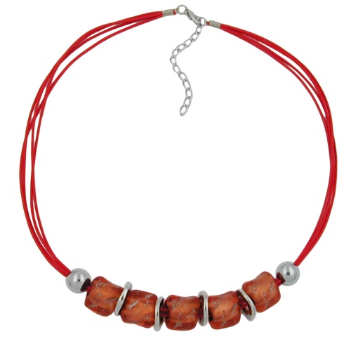 Wunderschöne Modeschmuck-Kette mit fünf 18mm großen, aufwendig hergestellten roten Kunststoffperlen als Blickfang. Bei den leicht viereckigen Steinperlen in der Farbe apricot-rot-transparent wurden die steinähnlichen Unebenheiten silbergrau ausgewischt. Kombiniert mit verchromten Kunststoff-Zwischenteilen wurden die Perlen auf 4 Strängen roter Baumwollkordel aufgezogen und mit einem silberfarbenen Karabiner plus Verlängerungskettchen aus eloxiertem Aluminium verschlossen. Die Kette ist 50cm lang. Alle Bestandteile dieser Modeschmuck-Kette wurden in Deutschland produziert und die Kette selbst in Handarbeit - made in germany - fertiggestellt.