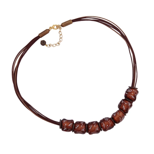 Wunderschöne Modeschmuck-Kette mit sieben 18x6mm großen, hochwertigen braun-transparent-silber-ausgewischten Kunststoffperlen als Blickfang. Bei den leicht viereckigen, unebenen Perlen, sogenannten Steinperlen, wurden die steinähnlichen Unebenheiten der dunkelbraun-transparenten Perle silbergrau ausgewischt. Kombiniert mit altmessingfarbenen Kunststoff-Teilen wurden die Perlen auf 6 Strängen von dunkel- und hellbrauner Baumwollkordel aufgezogen und mit einem goldfarbenen Karabiner plus Verlängerungskettchen aus eloxiertem Aluminium verschlossen. Eine kleine gravierte altmessingfarbene Rundperle aus Kunststoff bildet das Anhängsel der 50cm langen Kette. Farbiger Schmuck betont die Farben der Kleidung oder setzt zusätzliche Akzente und rundet Ihren Auftritt glanzvoll ab. Alle Bestandteile dieser Modeschmuck-Kette wurden in Deutschland produziert und die Kette selbst in Handarbeit - made in germany - fertiggestellt.