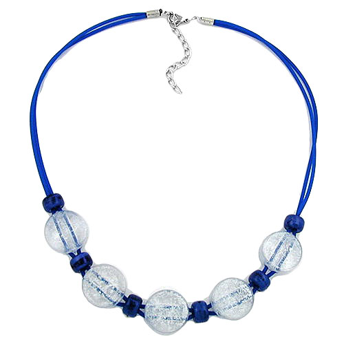 sommerliches Collier passend zur aktuellen Jeans-Mode, dekorative Kunststoffteile eisblau mit 2-Loch kombiniert mit kleinen Kunststoff-Rädchen dunkelblau, an 2-fach Gummiband blau, Verschluss silber-farbig mit Verlängerungskettchen, in Deutschland gefertigte Handarbeit