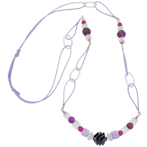 Collier mit Kunststoffperlen in ausgefallenen Formen und der aktuellen Sommerfarbe flieder-pastell, kombiniert mit Ringen und Würfelperlen in kristall-transparent, verbunden mit 2-fach Kordel 1mm flieder, längenverstellbar mittels Schiebeknoten