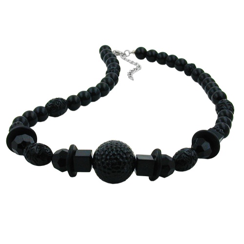 Das komplett schwarze, klassisch gefädelte Collier aus verschiedenen schwarz-glänzenden Perlen aus hochwertigem Kunststoff, mit silberfarbenem Karabiner-Verschluss plus Verlängerungskettchen aus eloxiertem Aluminium ist sowohl für das - Kleine Schwarze - Party-Kostüm wie auch als Trauerschmuck geeignet. Der dekorative Mittelteil mit der prachtvollen, 21mm großen Wabenperle verleiht der 50cm langen Kette eine gewisse Eleganz. Alle Bestandteile dieser Modeschmuck-Kette wurden in Deutschland produziert und die Kette selbst in Handarbeit - made in germany - fertiggestellt.
