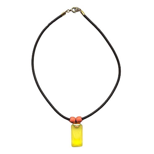 Collier mit Kunststoff-Viereck, 25x10mm, gelb-matt kombiniert mit zwei Kunststoff-Walzenperlen in orange-matt auf Gummi, Verschluss gold-farbig