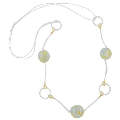 Wunderschöne pastellfarbene Modeschmuck-Kette mit 3 beidseitig gewölbten, 25x25x12mm großen, gelb-blau-grün-marmorierten Nuggetperlen aus hochwertigem Kunststoff, mit goldfarbenen Endteilen an perlmutt-weißen Kunststoff-Ringen und an doppelter weißer Baumwollkordel befestigt. Die ca. 100cm lange Kette passt gut zur hellen, sommerlich leichten Bekleidung. Lange Ketten ab 60cm eignen sich gut als Pulloverketten und können ohne den Verschluss zu öffnen über den Kopf angelegt werden. Farbiger Schmuck betont die Farben der Kleidung oder setzt zusätzliche Akzente. Alle Bestandteile dieser Modeschmuck-Kette wurden in Deutschland produziert und die Kette selbst in Handarbeit - made in germany - fertiggestellt.