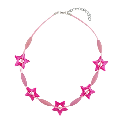 Trendige pinke Modeschmuck-Kette mit 5 pink-seidigfarbenen 27mm großen Sternen als Hingucker. Die Sterne sowie die rosafarbenen Holzoliven als Zwischenperlen wurden an 2 Stränge rosafarbener Baumwollkordel kunstvoll eingeknotet. Aufgrund der kurzen Länge von 42cm ist diese wunderschöne Halskette auch als Teenagerschmuck geeignet. Farbiger Schmuck betont die Farben der Kleidung oder setzt zusätzliche Akzente. Alle Bestandteile dieser Modeschmuck-Kette wurden in Deutschland produziert und die Kette selbst in Handarbeit - made in germany - fertiggestellt.