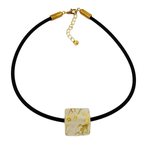 Einfache Modeschmuck-Halskette Collier mit einer auffälligen, 28x26mm großen, leicht eckigen Walzenperle aus hochwertigem Kunststoff, kristall-matt (durchsichtig) mit aufgespritzten Goldfäden, aufgezogen auf 6mm dicken, schwarzen Vollgummi, geschlossen mit einem goldfarbenen Karabiner plus Verlängerungskettchen aus eloxiertem Aluminium. Alle Bestandteile dieser Modeschmuck-Kette wurden in Deutschland produziert und die Kette selbst in Handarbeit - made in germany - fertiggestellt.